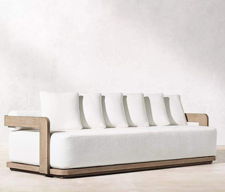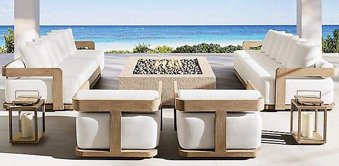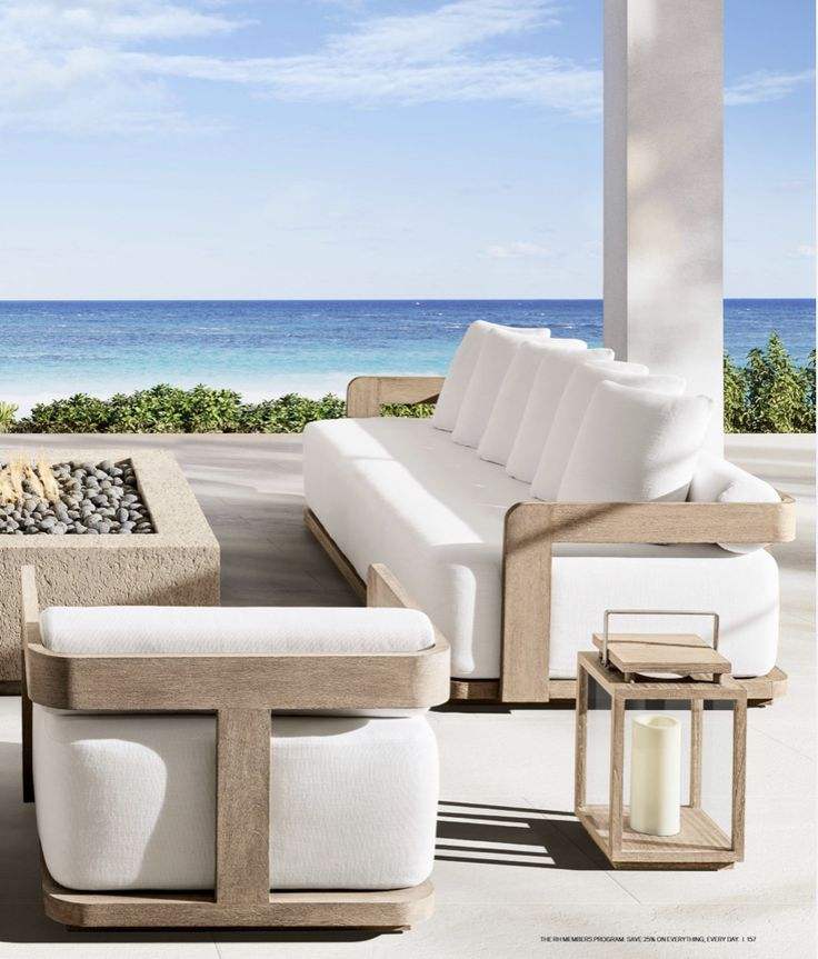 Elegant Outdoor Living Room Set Teak Wood Frame with Neutral Cushions for Modern Resort-Style Patio or Pool Deck Spaces