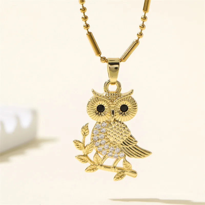 Elegant Owl Pendant Necklace 18K Gold Plated With Inlaid Zircon Bird And Bamboo Chain For Women Daily Jewelry