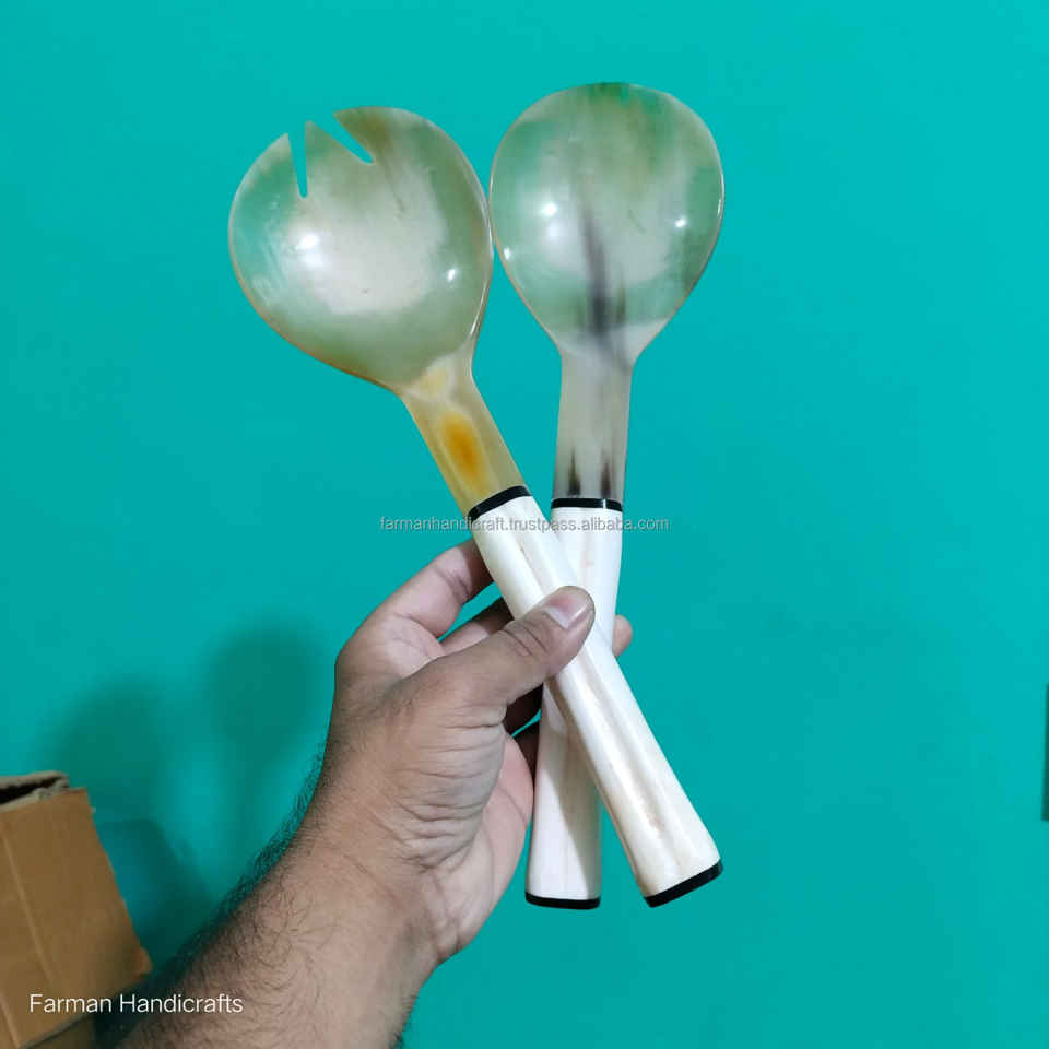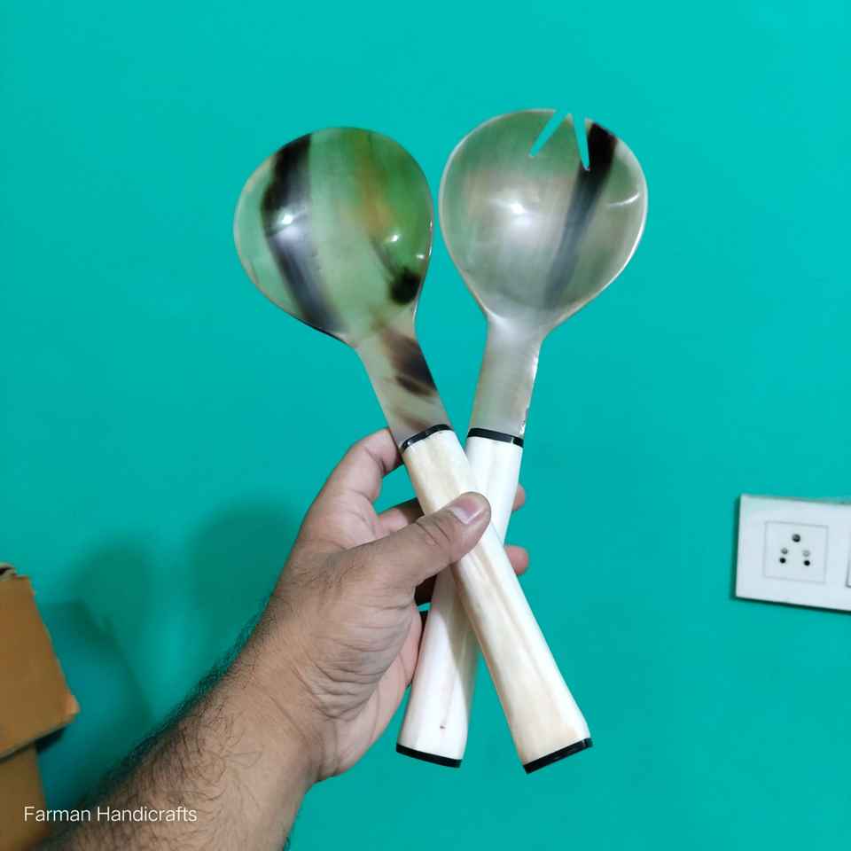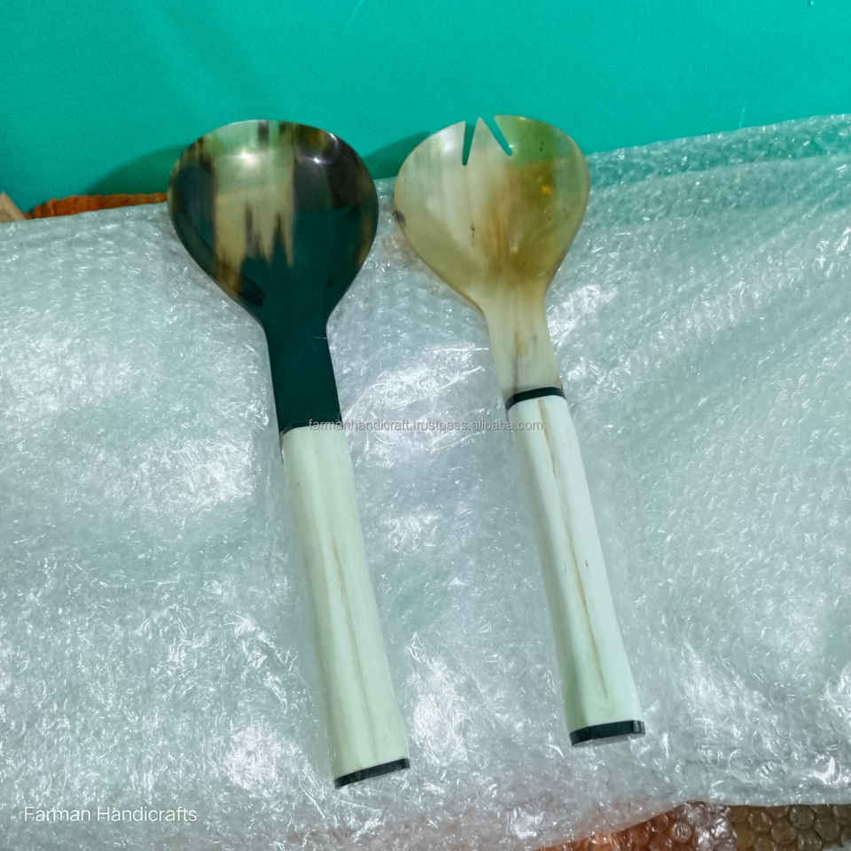 Elegant Ox Horn Salad Server Spoon Set with White Bone Handle Handmade Tableware At Cheap Price