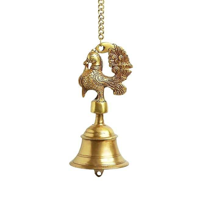 Elegant Peacock Printed Brass Hanging Bell Hand Etched Outdoor Music Themed Temple Home Living Room Pooja Decorative Gift Item