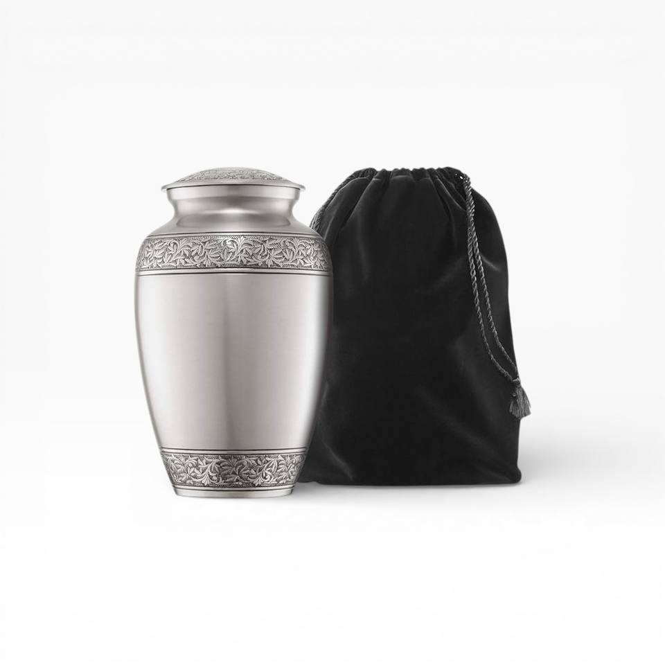 Elegant Pearl White Hammered Texture Keepsake Urn with Silver Leaf Engraved Bands and Secure Lid