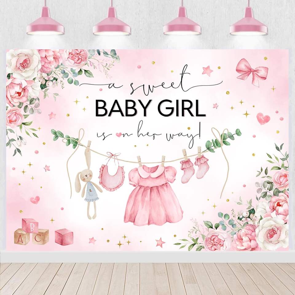 Elegant Pink Floral Themed Shower Backdrop 7x5ft Custom Stock for Girl's Newborn Party Decor Featuring Butterflies Dress