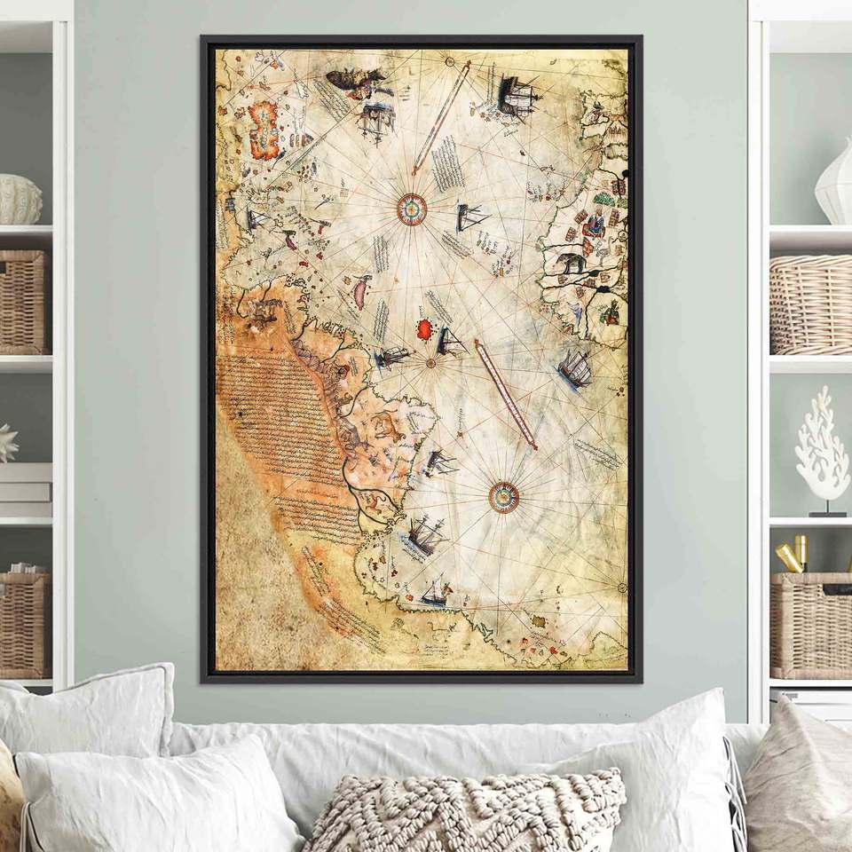 Elegant Piri Reis Antique Map Print Canvas Artwork, Flat Design,BLACK FRAMED CANVAS