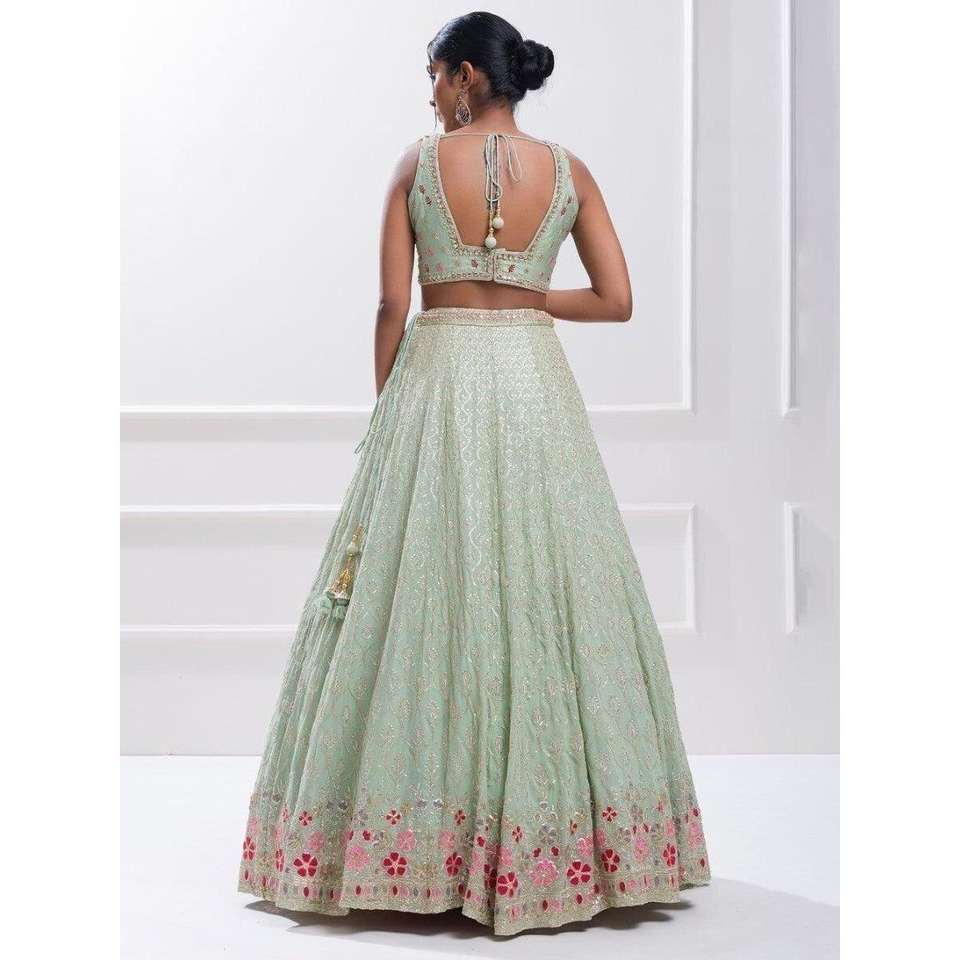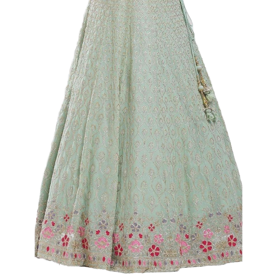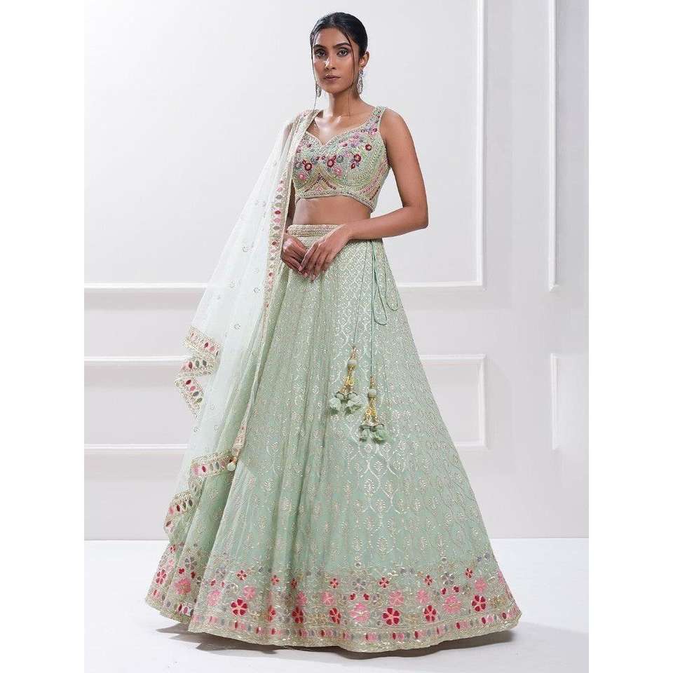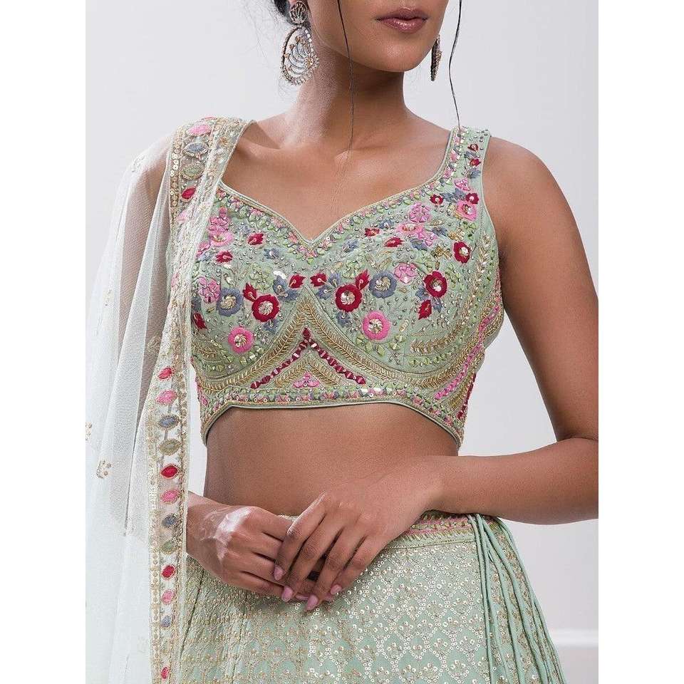 Elegant Pista Green Sequin Georgette Reception Wear Lehenga Choli Evening Dresses