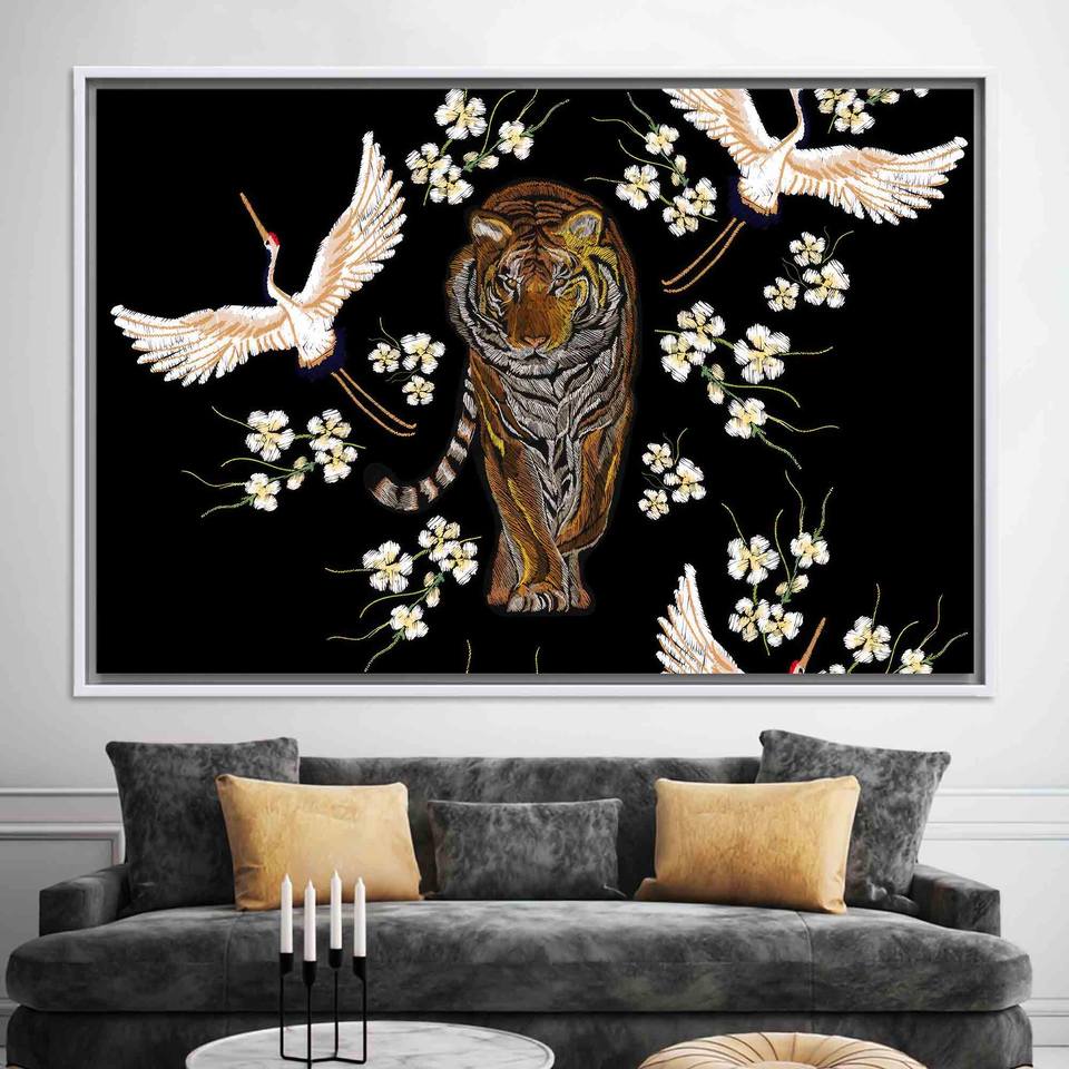 Elegant Printed Canvas Artwork: Japanese Decor with Tiger and Cranes,WHITE FRAMED CANVAS