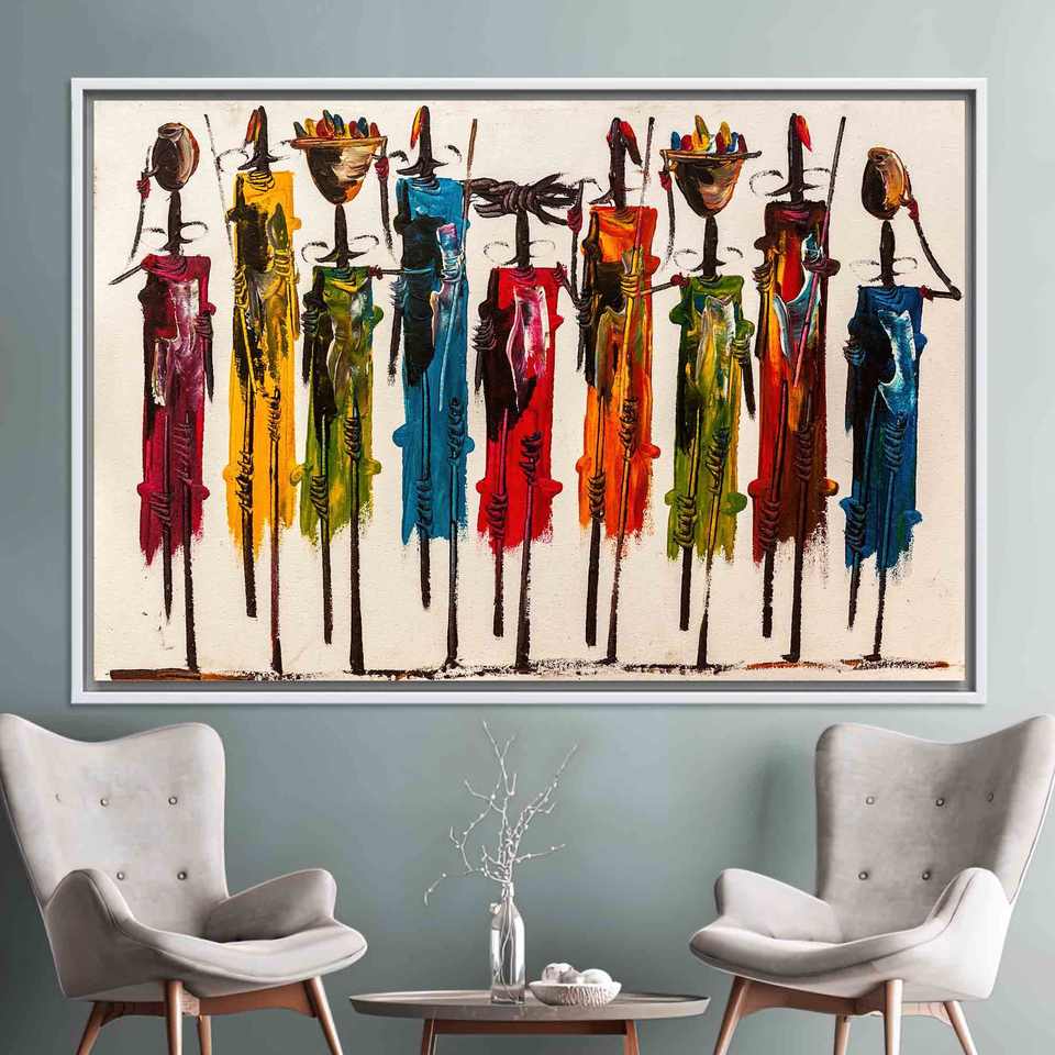 Elegant Printed Canvas: Vibrant African People Stained Glass Art,WHITE FRAMED CANVAS