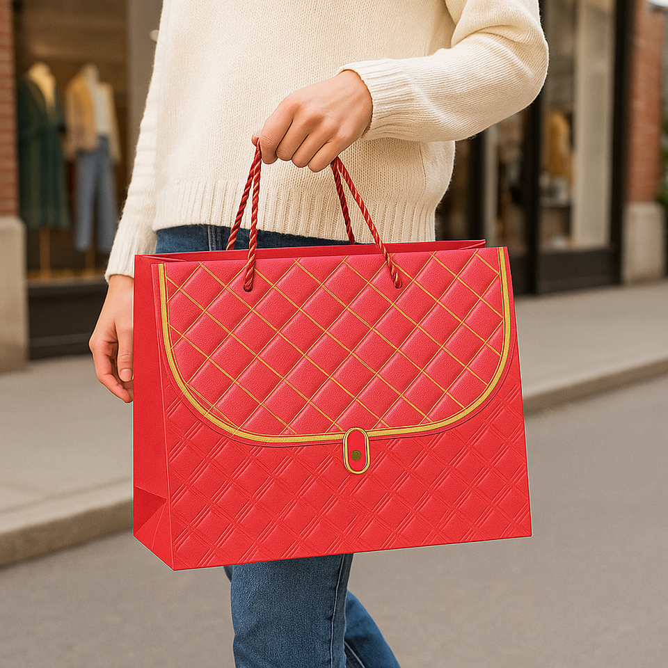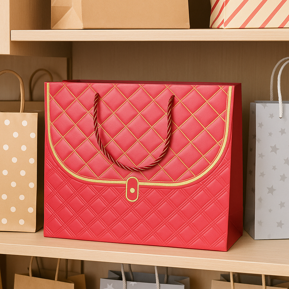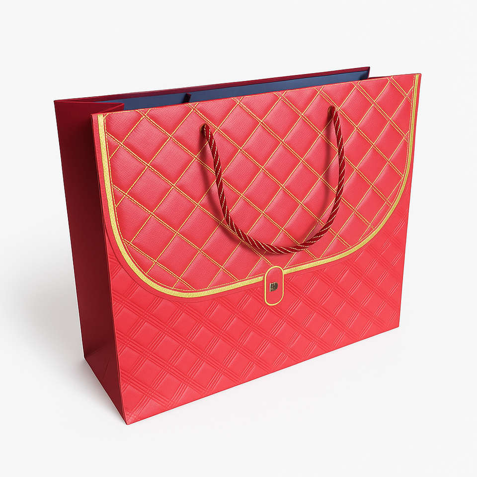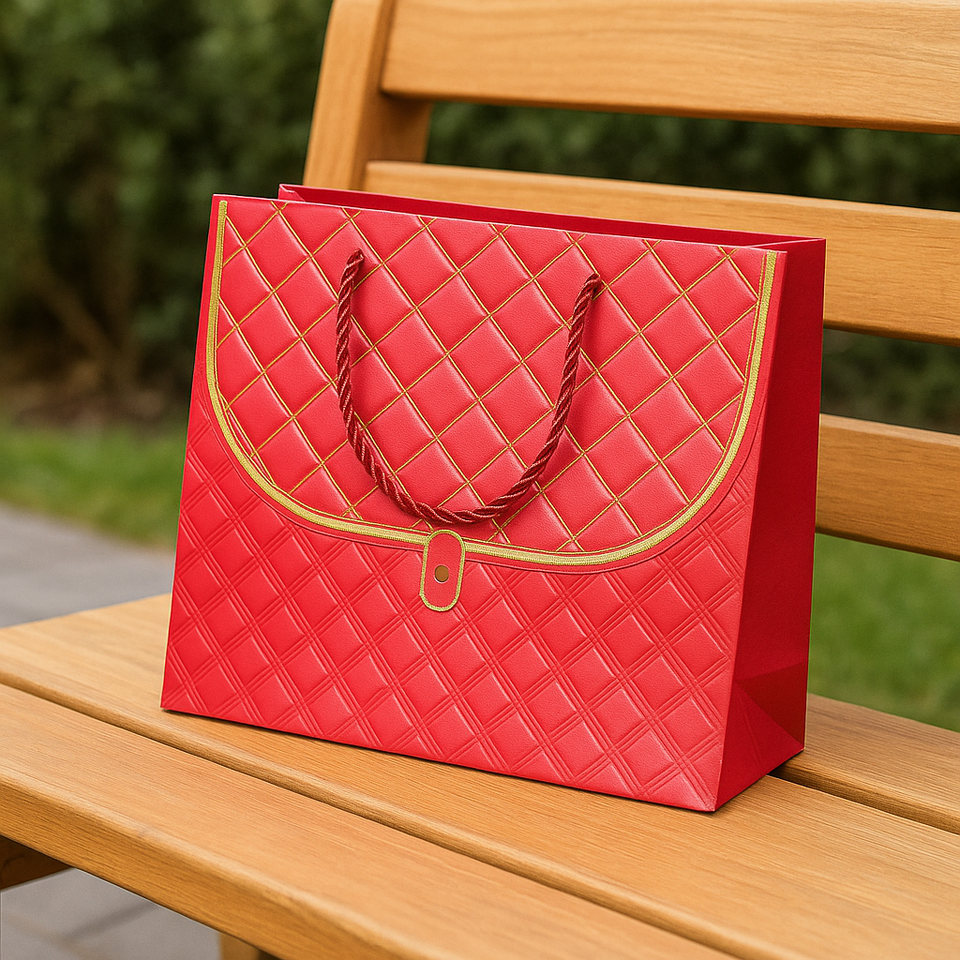 Elegant Red Quilted Gift Bag with Gold Trim and Rope Handles Stylish Durable Perfect for Special Occasions
