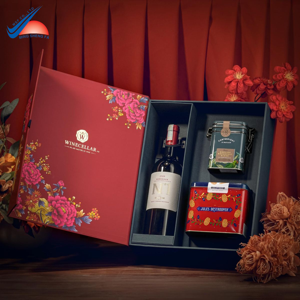 Elegant Red and Gold New Year Gift Box for Wine and Snacks