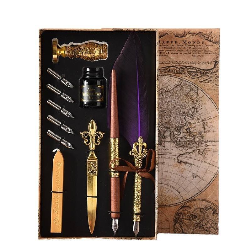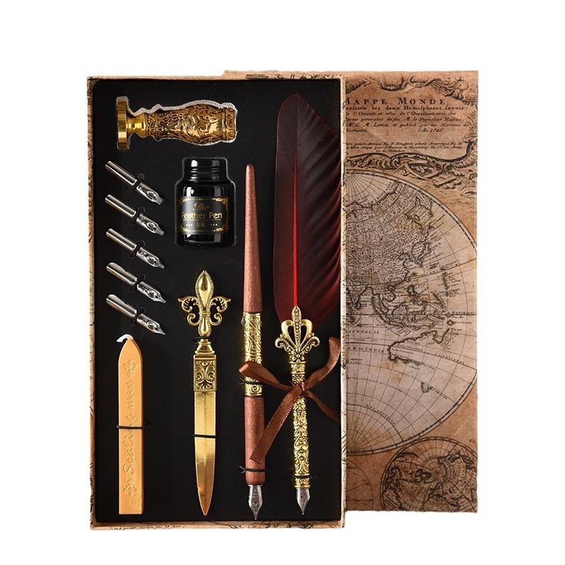 Elegant Retro European Feather Pen Set 0.5 mm Metal Writing Width with World Map Box