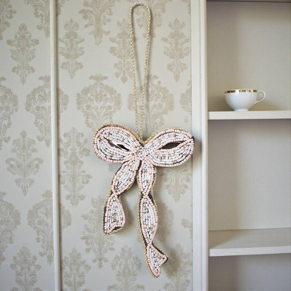 Elegant Ribbon Zari Hanging | Pink & White Beaded Bow Ornament for Wall, Tree, Gift Decor & Festive Decoration