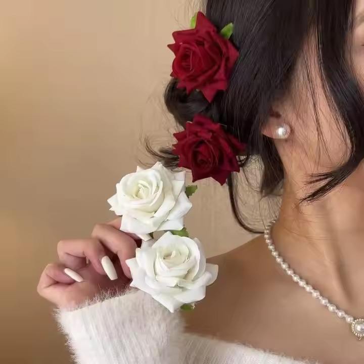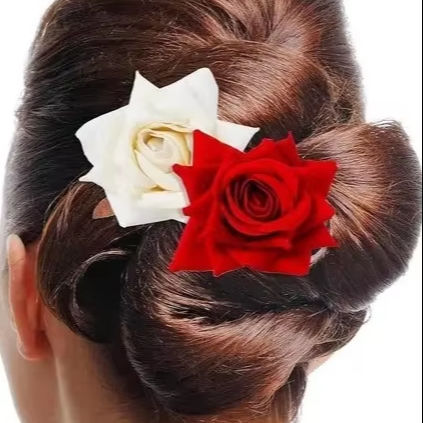 Elegant Rose Hair Clips for Women Red and White Artificial Flower Hair Accessories for Weddings Parties and Daily Wear