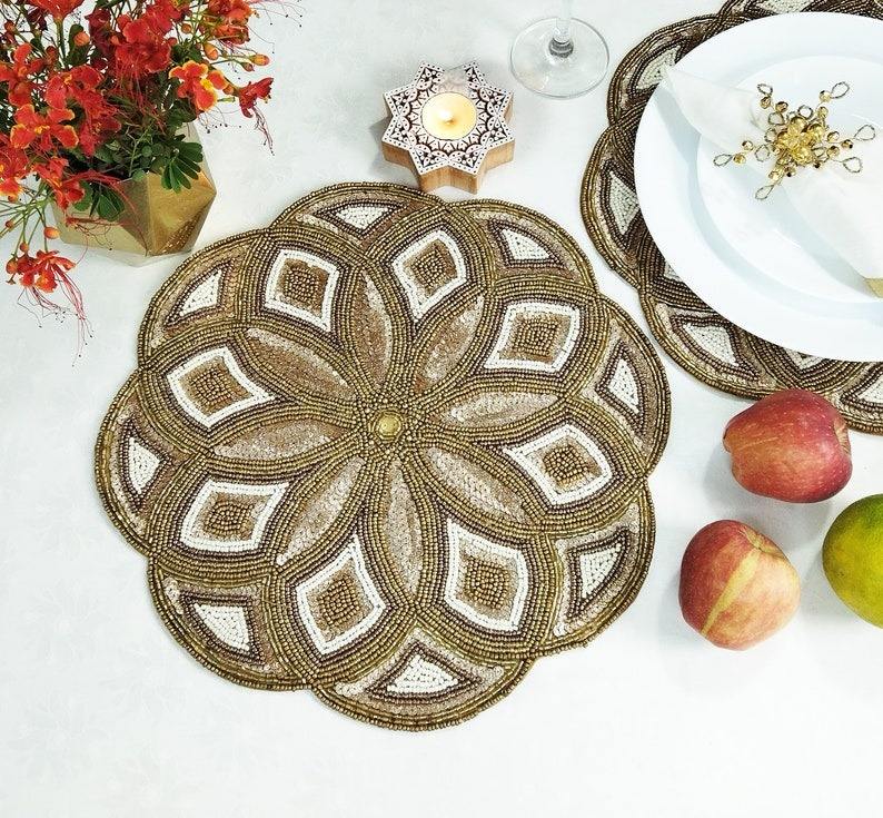 Elegant Round Beaded Table Placemat with Petal-Inspired Floral Design Hand-Beaded Decorative Mat for Dining Table Coffee Table