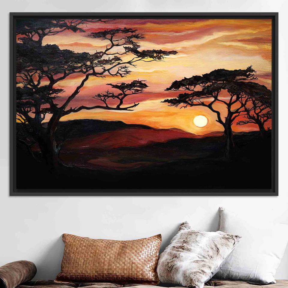 Elegant Savannah Sunset Printed Canvas: African Tree Landscape,BLACK FRAMED CANVAS