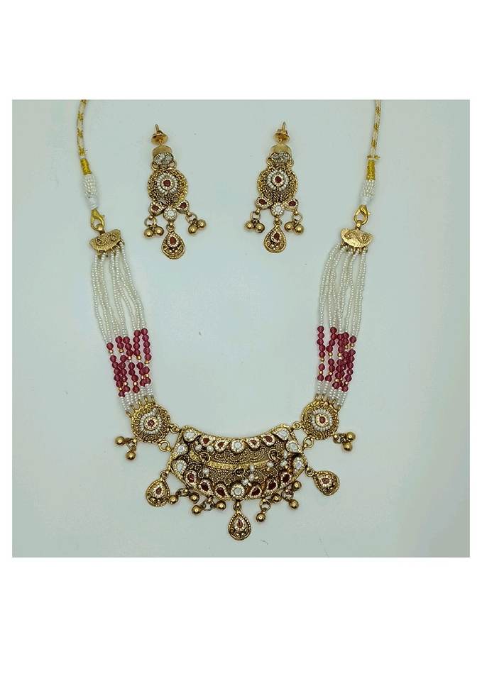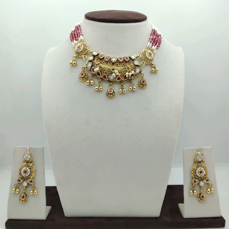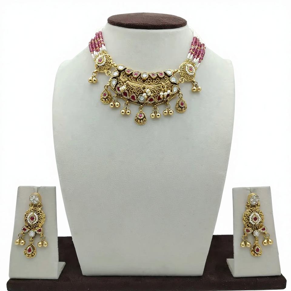 Elegant Silver Choker Necklace Set with Pink Pearl Beads Gold Plated Traditional Design Matching Earrings for Wedding Wear