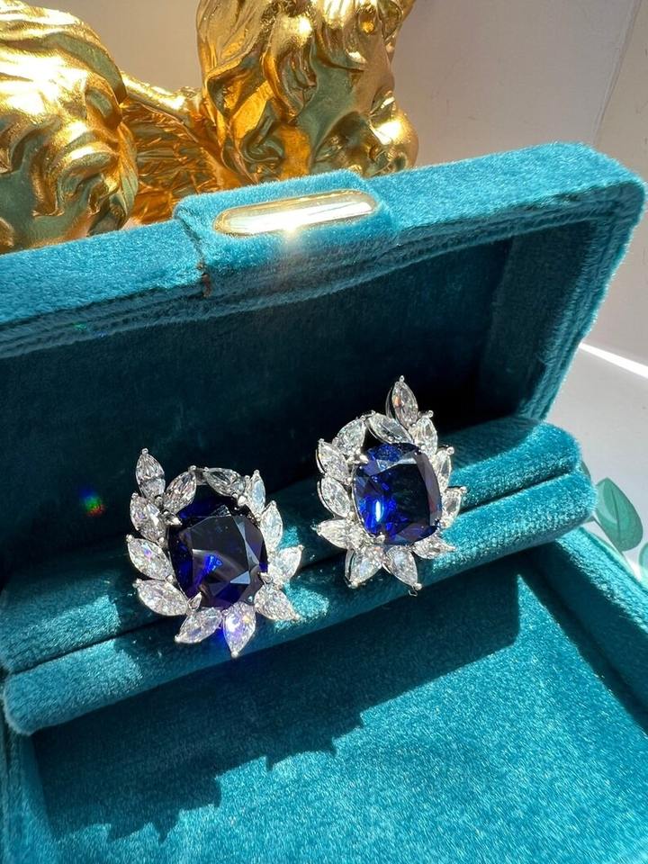 Elegant Silver Royal Blue Stone Stud Earrings Surrounded With Sparkling White Leaf Design Luxury Bridal Party Earring For Women