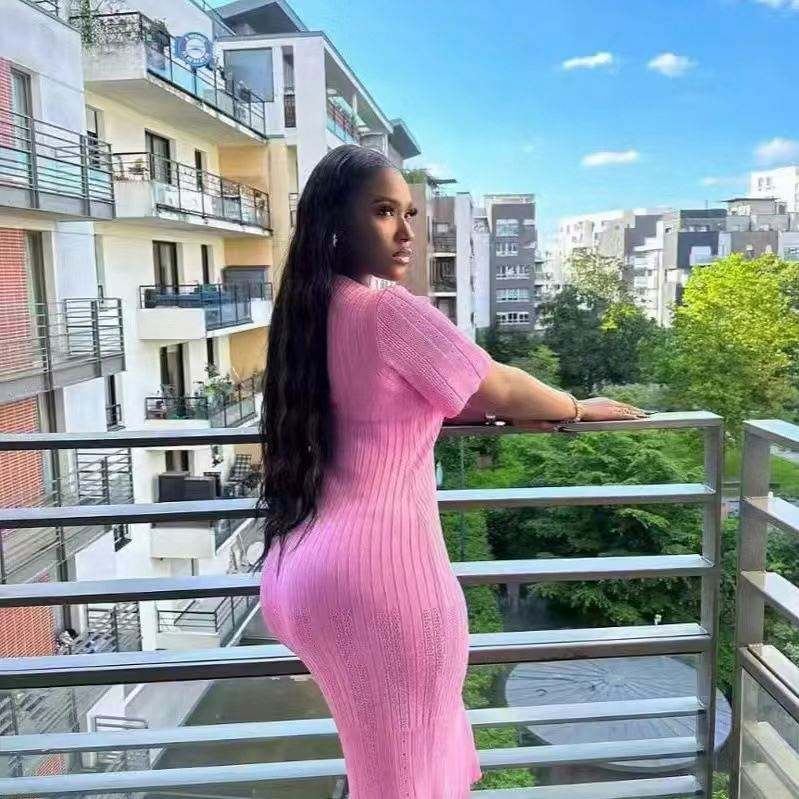 Elegant Slim Knitted Long Dress Women's Letter Single Breasted Short Sleeved Designer Vintage Knitting Dresses