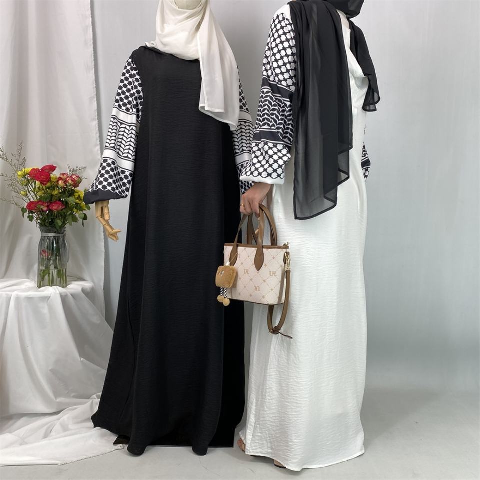 Elegant Soft Linen Abaya Robe With Palestine Keffiyeh Printed Sleeve Detailing Modest Islamic Women Clothing for Ramadan 6827