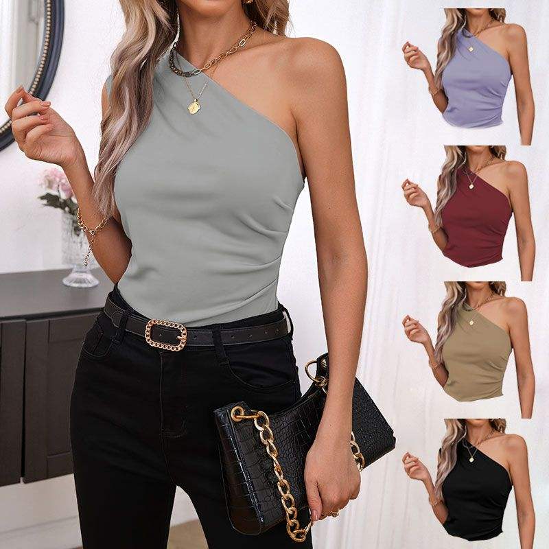 Elegant Solid Pattern Tank Top for Women Summer Trendy Casual Knitted Irregular Slant One Shoulder Pleated Sleeveless Top Winter