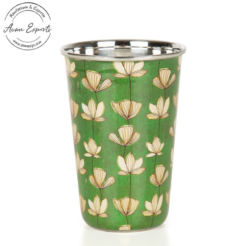 Elegant Stainless Steel Tumbler with Green Floral Enamel Design Durable Eco Friendly Drinkware for Home and Gifting