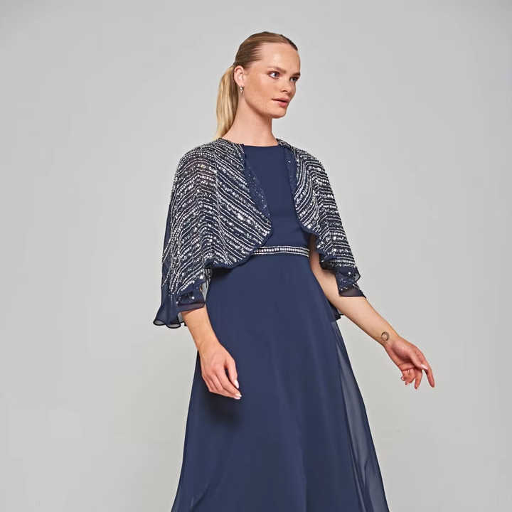 Elegant Straight Silhouette Embellished Pearl Sequin Cape Sleeve Maxi Dress Full Length with Embroidered Belt Beaded Decoration