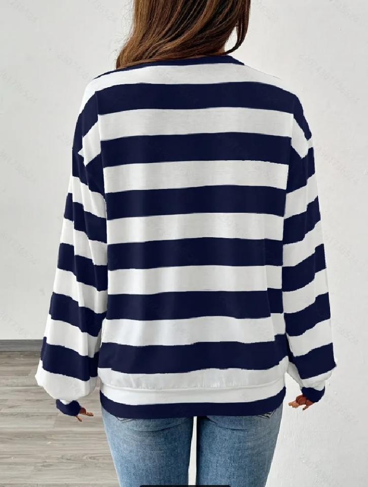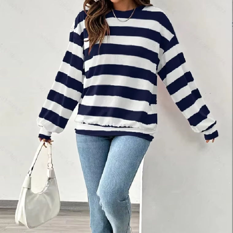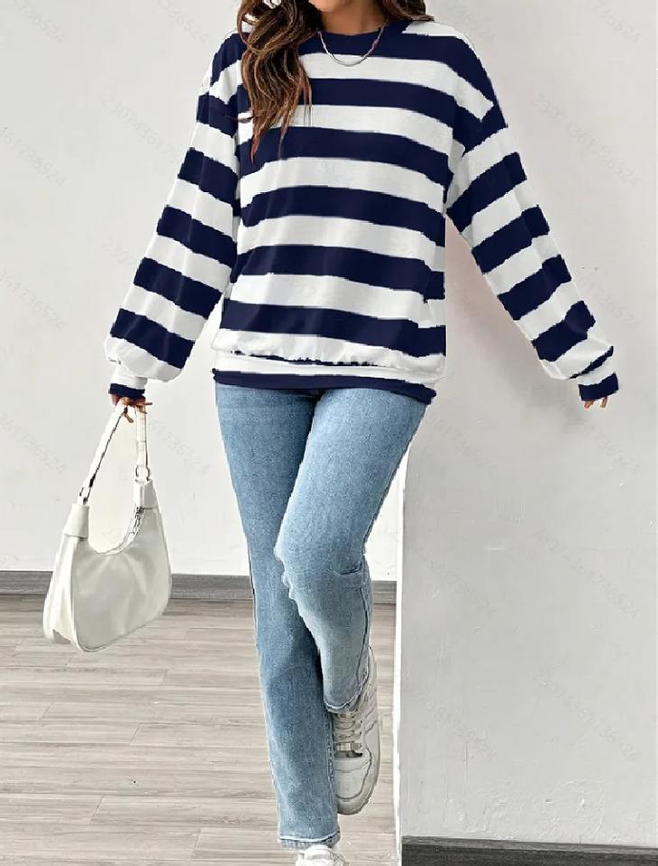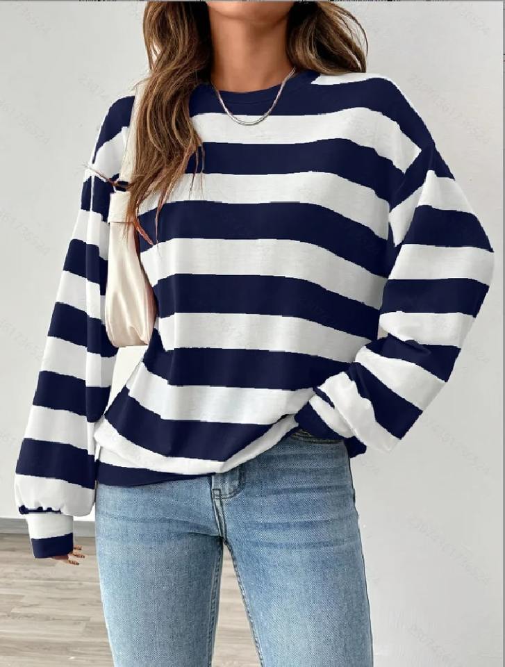 Elegant Striped T-Shirt for Women Fashionable Autumn Winter Comfortable 100% Cotton Knitted Round Neck Long Sleeve