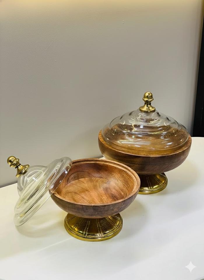 Elegant Style Wooden Bowl With Glass Lid For Luxury Dining Table Setup Creating Sophisticated And Natural Serving Experience