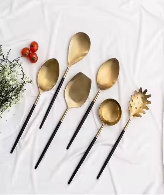 Elegant Top Design Brass Salad Server Spoon & Fork Set with White Enamel Handle for Dining Table Gold Salad Server Sets