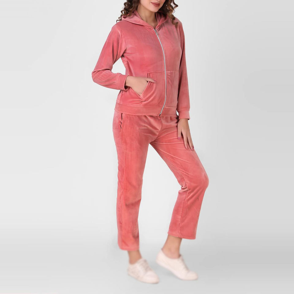 Elegant Velvet made Pink Womens Hooded Sweatshirt And Jogger Set For Casual Comfort And Stylish Everyday Wear