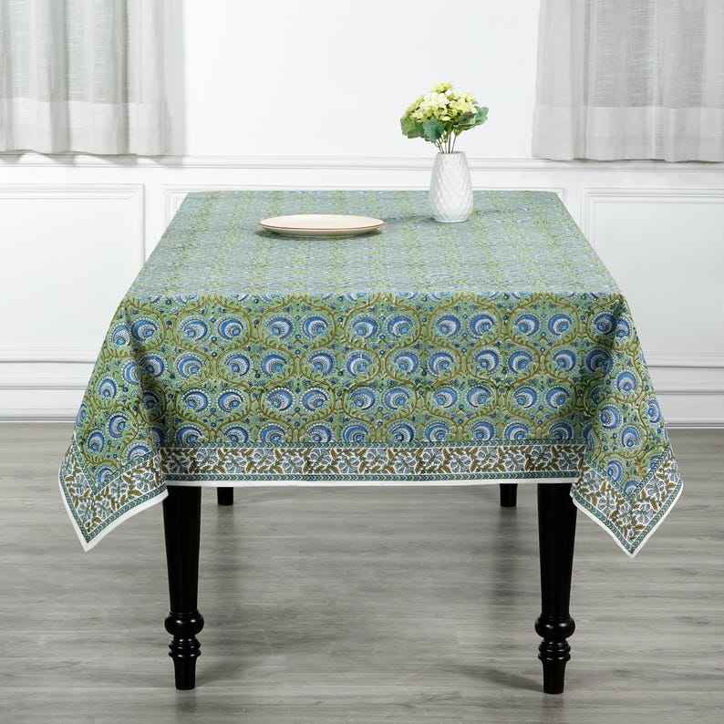 Elegant Verdant Mist Floral Handmade Block Printed Indian Cotton Tablecloth for Everyday Dining Table Use