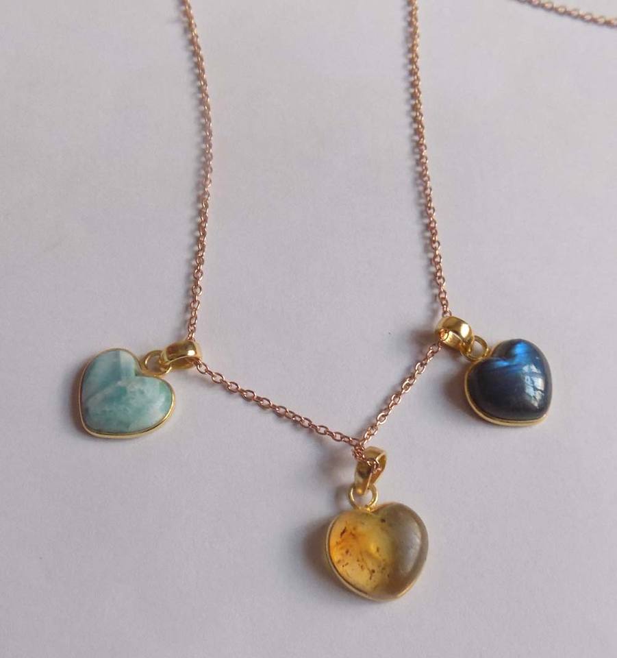 Elegant Vintage Three-Heart Necklace Silver & Gold Plated with Smooth Heart-Shaped Larimar Gems Bezel Set for Weddings