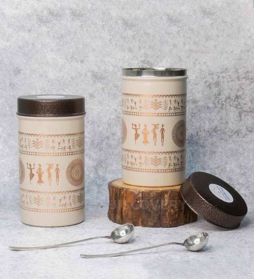 Elegant Warli Art Storage Canister Set with Airtight Steel Lid Durable Metal Jars for Tea Coffee Sugar Stylish Ethnic Kitchen