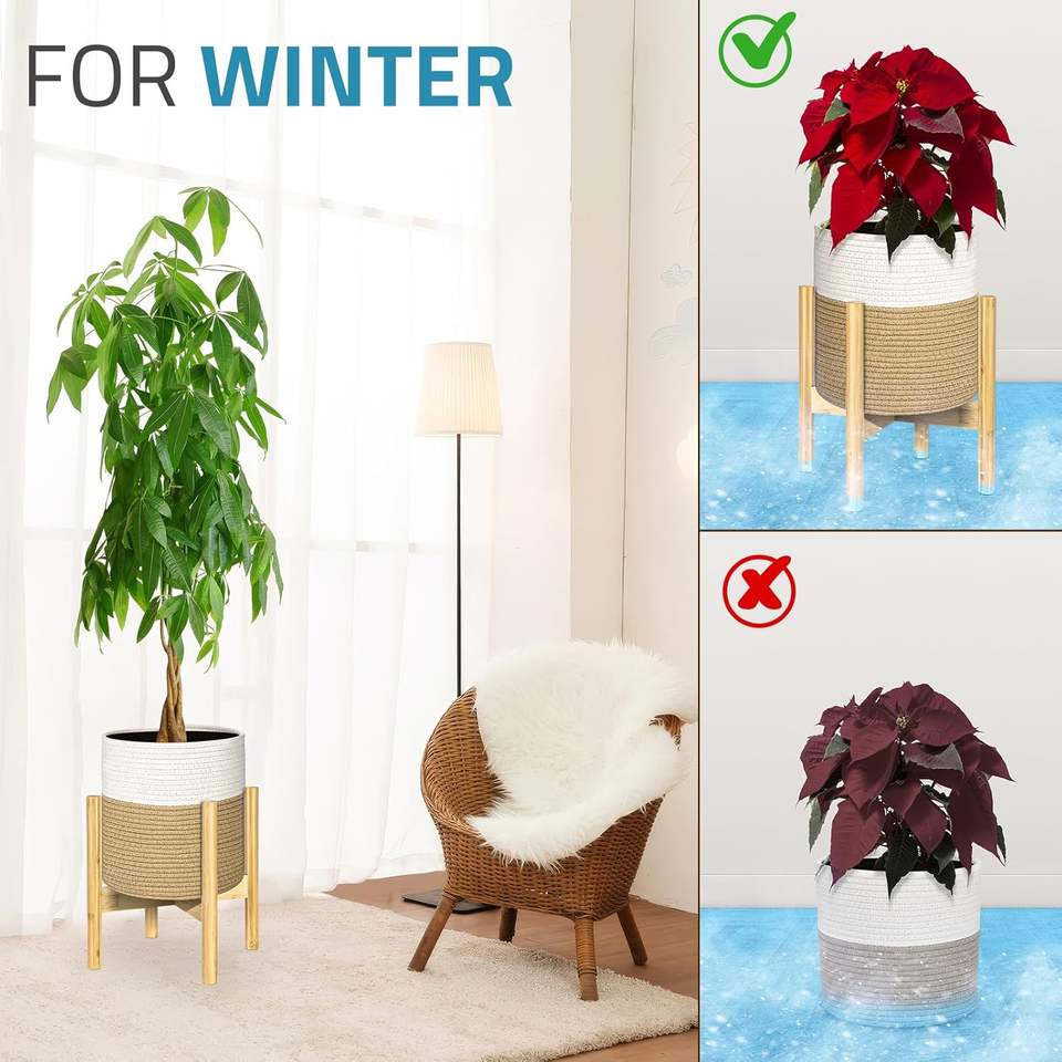 Elegant White Beige Woven Round Hand Carved Luxury Vintage Bamboo Plant Stand Stylish Indoor Garden Decor 10 Inch Pots Home Use