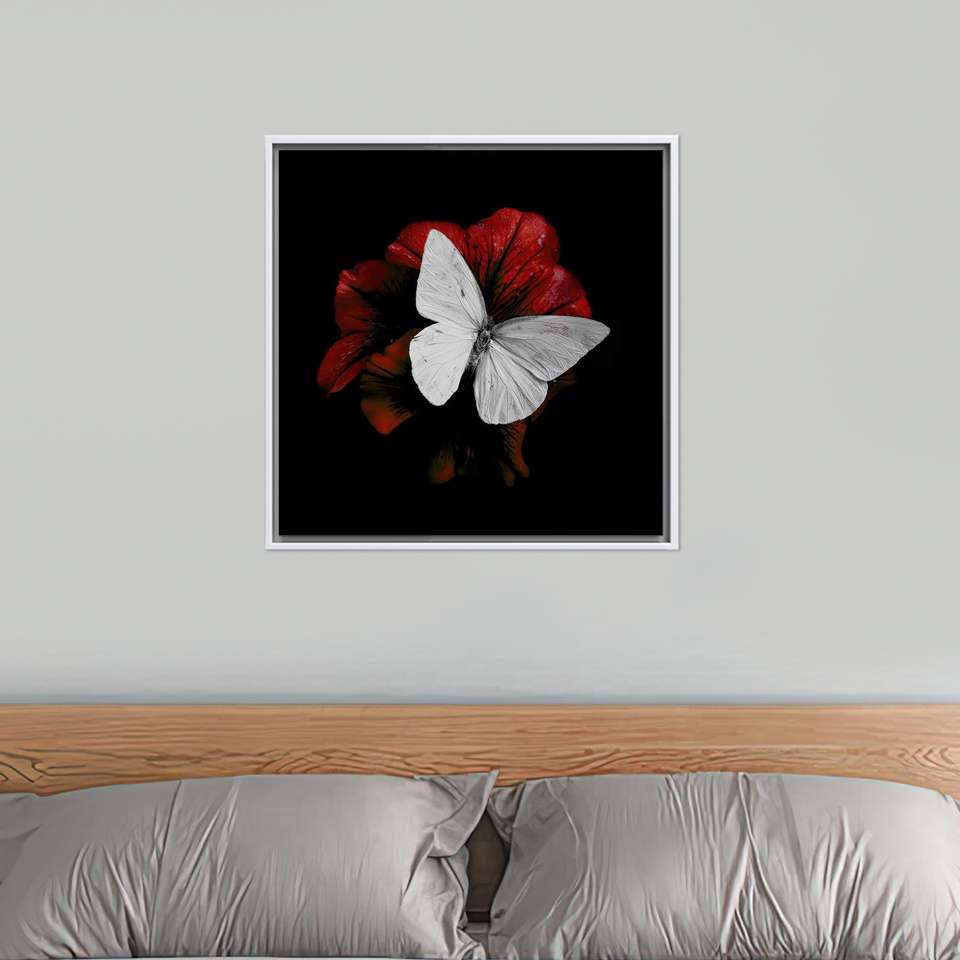 Elegant White Butterfly on Red Flower Printed Canvas Art Poster,White Framed