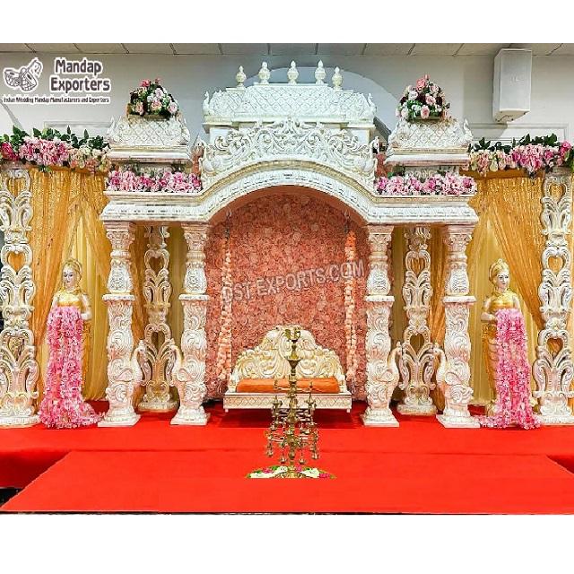 Elegant White Gold Manavarai Saree Function StageName