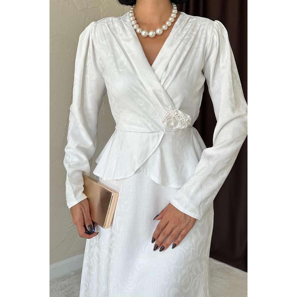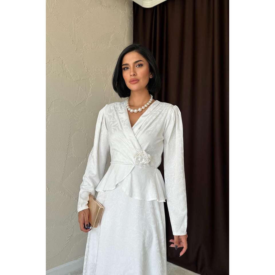 Elegant White Long Sleeve A-Line Wrap Dress With Pleat Detail Zipper Back For Wedding