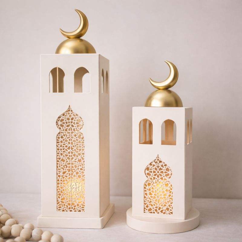 Elegant White Metal Crescent Lantern Duo with Tall Slim Design Intricate Cutwork Warm Candle Glow Perfect Festive Home Decor