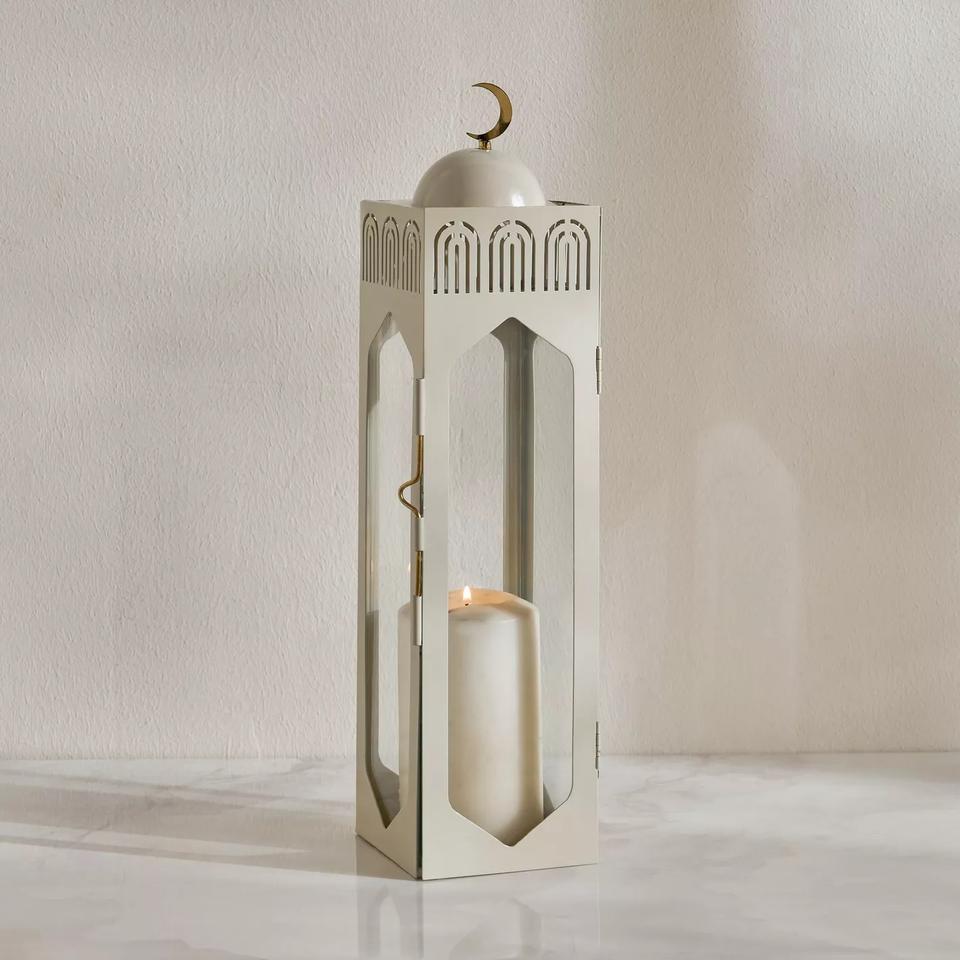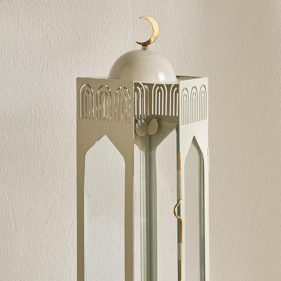 Elegant White Metal Ramadan Lantern with Glass Panels Crescent Moon Top Tall Design Soft Candle Glow for Modern Home Decor