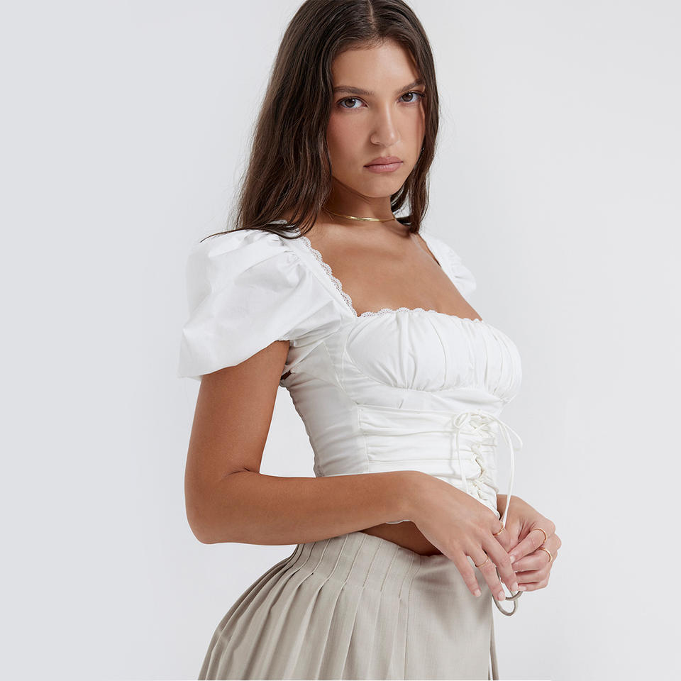 Elegant White Women's Crop Top Short Sleeve Fitted Design with Lace Trim Wholesale Blouses & Shirts