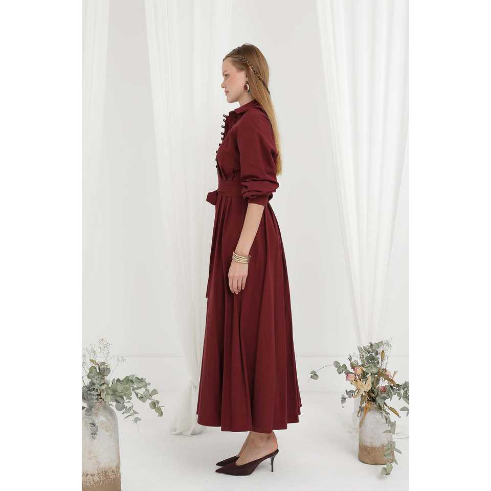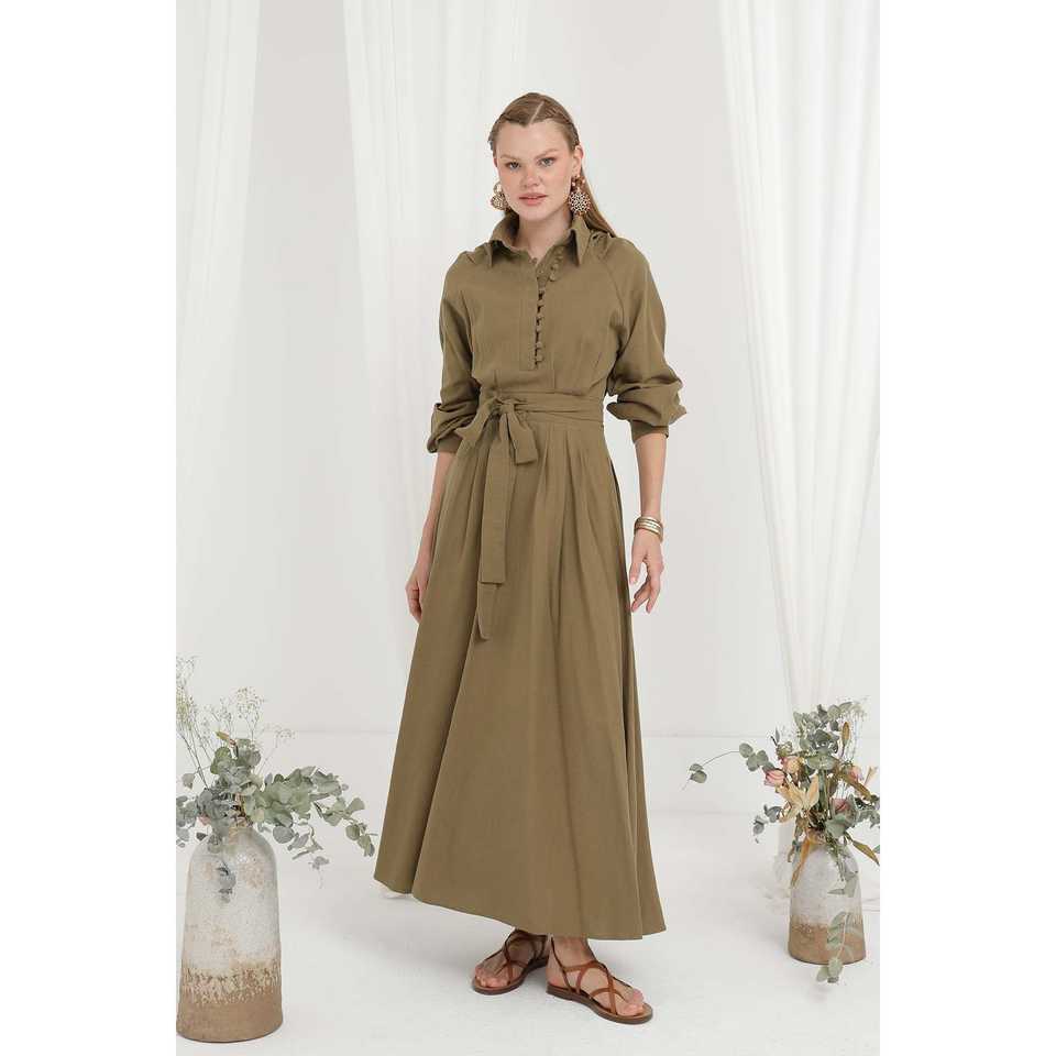 Elegant Women's Belted Mandarin Collar A-Line Dress Stone Color Comfortable Wrap And Tie Evening Wear