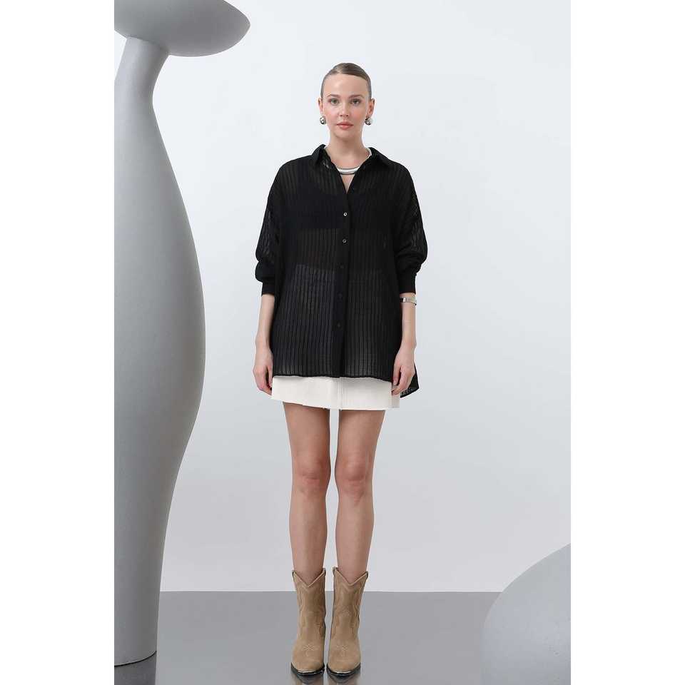 Elegant Women's Black Chiffon Striped Shirt With Sheer Layer Casual Everyday Wear Long Sleeve Blouse Size M