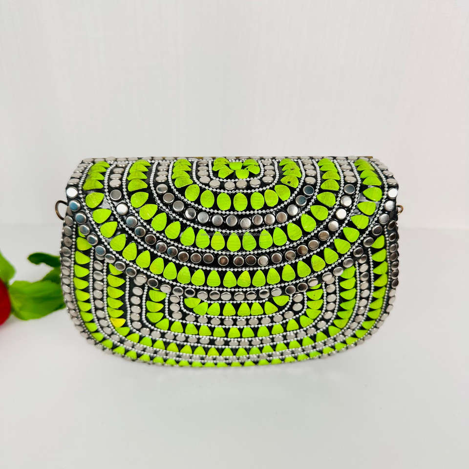 Elegant Women's Evening Sling Purse Vintage Polished Sculpture Crossbody Bag Neon Green Metal Mosaic Clutch Modern Antique Style