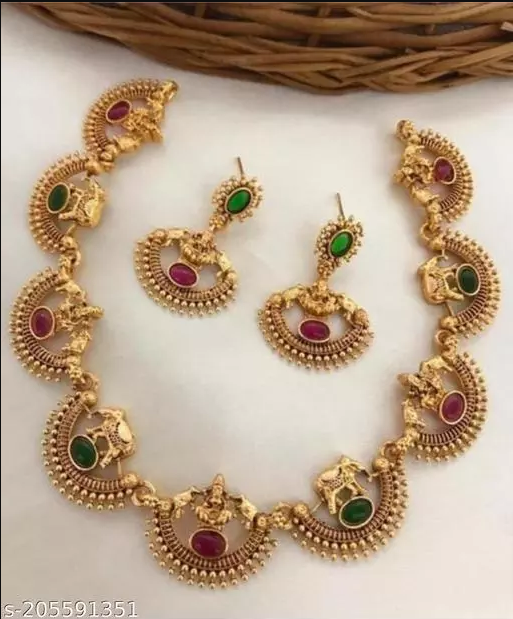 Elegant Women's Gold Plated Elephant Motif Necklace Set Ruby Red Stone Studded Traditional South Indian Ethnic Matte Finish