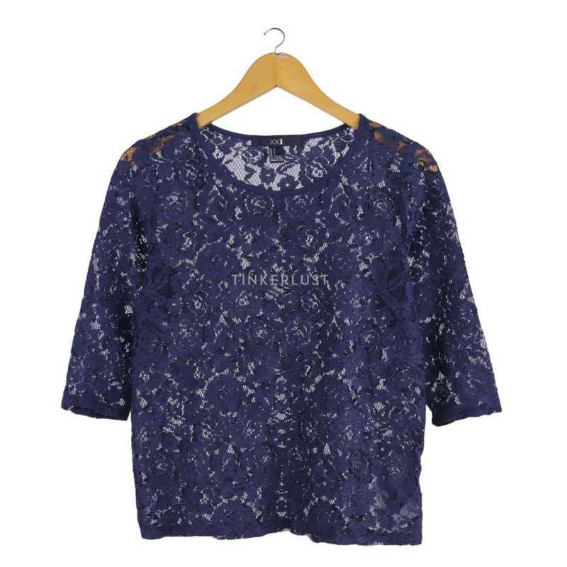 Elegant Women's Navy Blue Office Casual Top Breathable Knitted Polyester Blouse with Printed Lace Decoration Summer wear