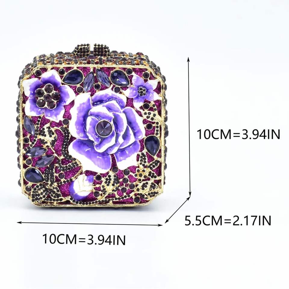 Elegant Women's Oil Floral Crystal Evening Bag Square Box Rhinestone Handbag with Chain Decoration for Wedding Party Prom