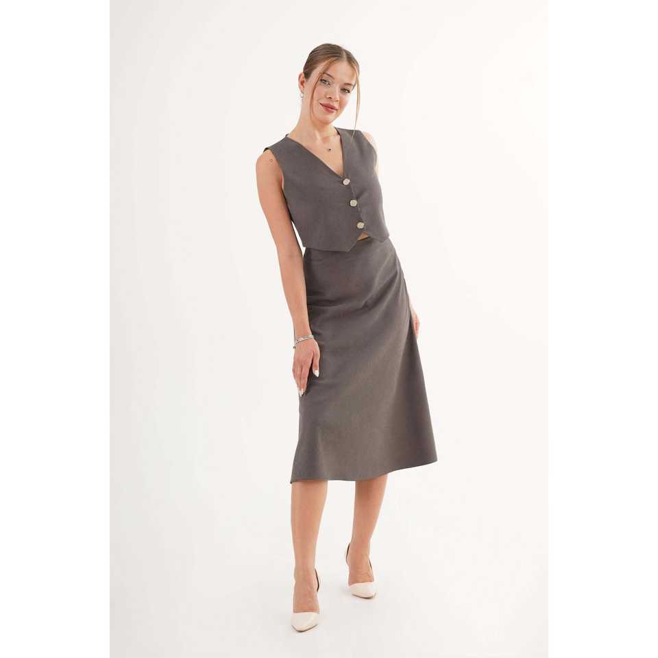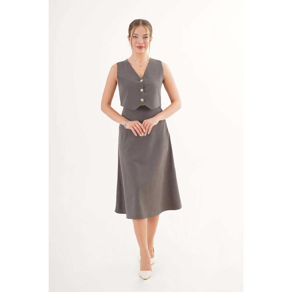 Elegant Women's Sleeveless Two-Piece Set Anthracite Satin Vest And Skirt With Gold Buttons