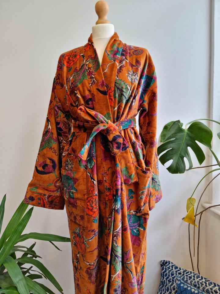 Elegant Womens Cotton Kimono Robe Long Floral Pattern Coral Fleece Soft Velvet Printed Maxi Buttoned Sleepwear with Lace Trim