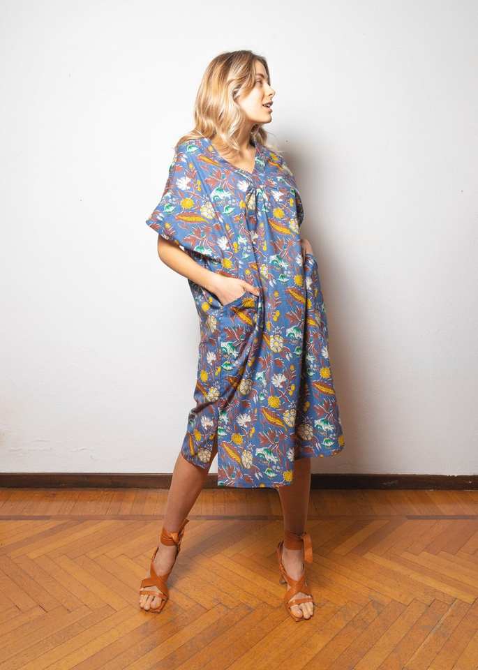 Elegant Womens Indian Cotton Kaftan Dress Hand Printed Blue Floral Lightweight Summer Wear