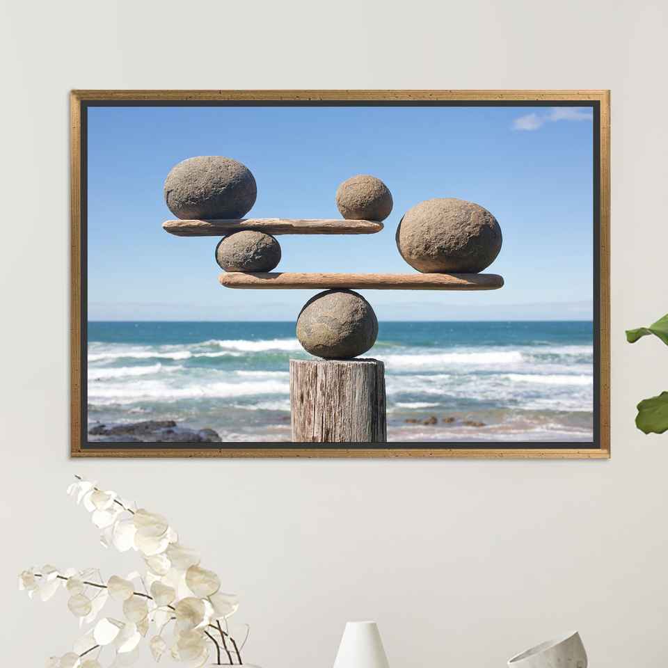 Elegant Zen Stone Balance Coastal Canvas Print: Meditative Beach Art,GOLD FRAMED CANVAS