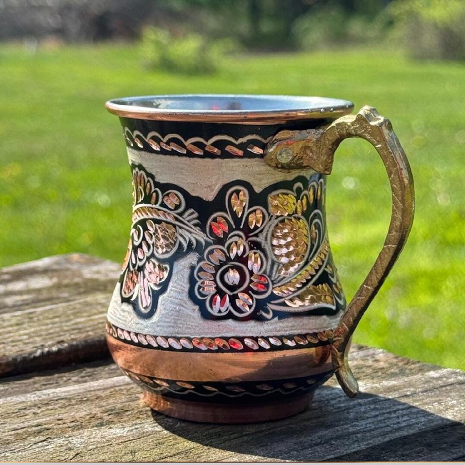 Elegant bulbous copper mug with a highly detailed, embossed peacock feather pattern. Available at wholesale prices.
