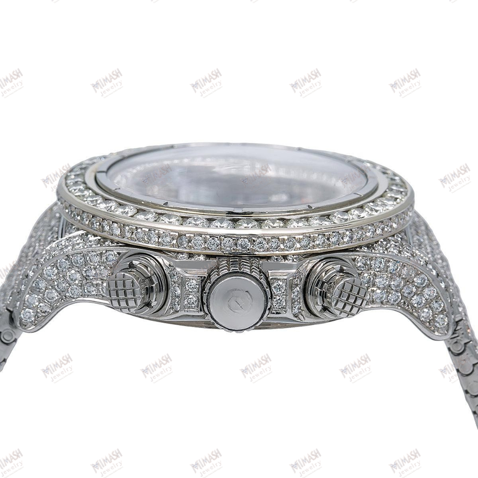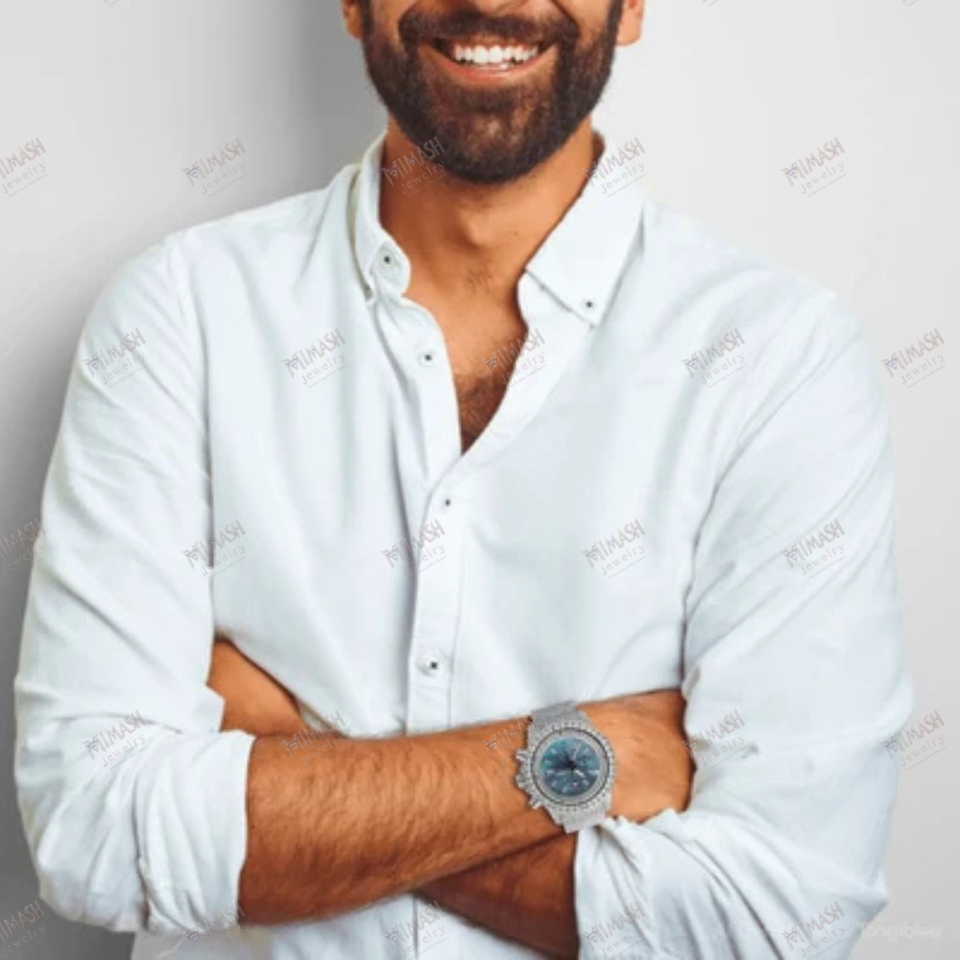 Elegant chronograph watch with diamond bezel, sky-blue dial, and full pave band for a bold, luxurious, and timeless statement.